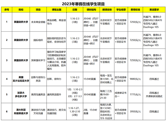依据我校发展国际化教育的方针,2023年寒假,我校国际处引进了4所世界名校的资源,包括英国剑桥大学、美国宾夕法尼亚大学、加拿大多伦多大学、澳洲阿德莱德大学共6个项目供学生参考和学习。