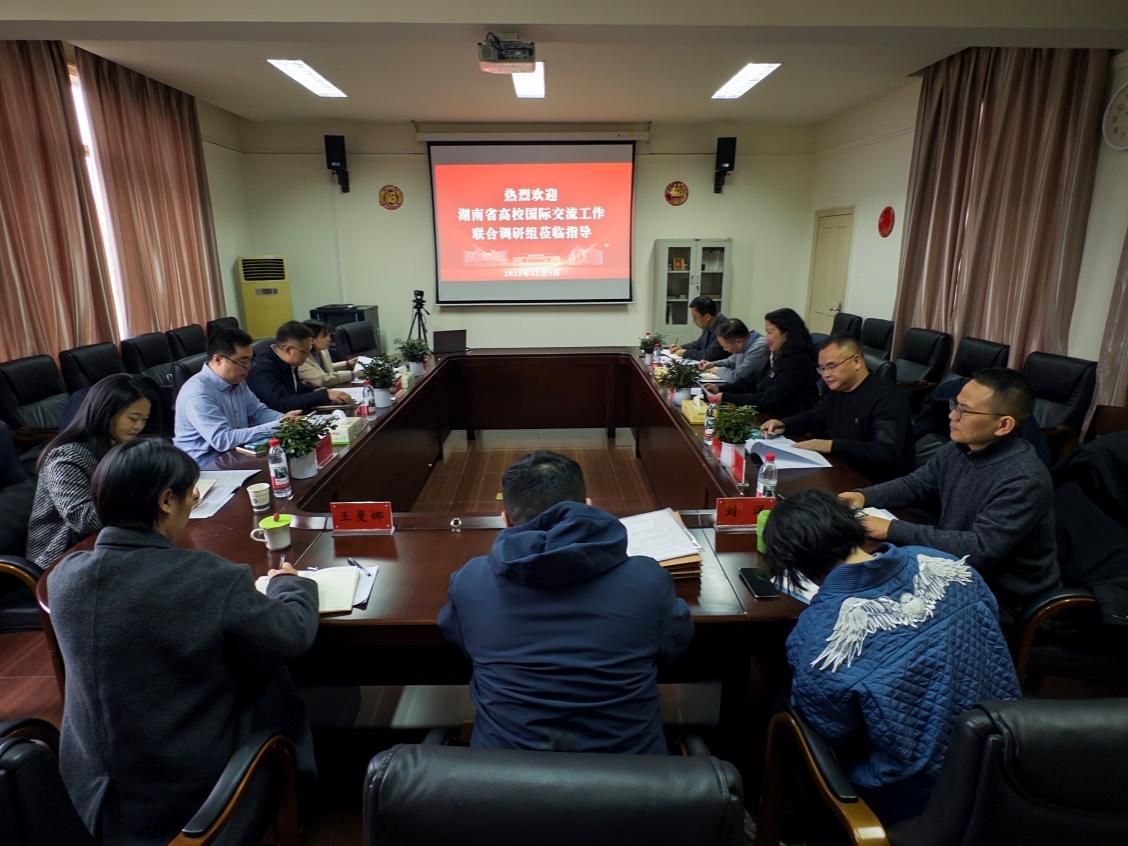 2025年12月5日,中共湖南省委外事工作委员会办公室(以下简称“省委外事办”)出国管理处处长张科、副处长覃夕航,与湖南省教育厅国际处处长颜丹、一级主任科员何丹组成联合调研组来我校开展调研。调研座谈会由我校国际交流与合作处(港澳台办公室)处长谭丹主持,国际交流与合作处、班戈学院、国际学院相关负责人参加座谈。